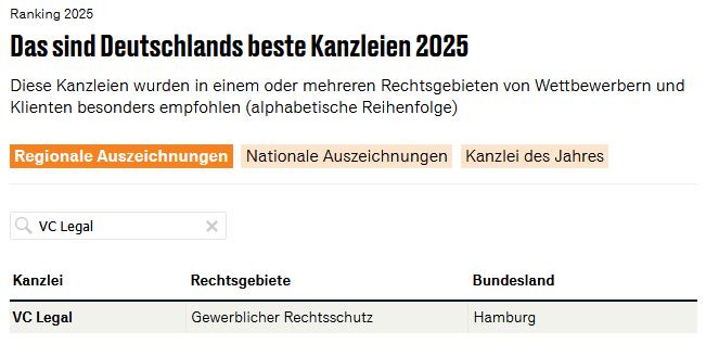 VC Legal wurde dieses Jahr erneut als eine der besten Kanzleien Deutschlands für Gewerblichen Rechtsschutz im Ranking von Best Lawyers und Handelsblatt ausgezeichnet. Wie bereits 2024 konnte diese Auszeichnung 2025 erneut erreicht werden.